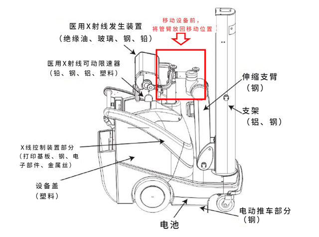二、移動姿勢,移動DR的結構跟配件有醫(yī)用X射線發(fā)生裝置(絕緣油、玻璃、鋼、鉛),醫(yī)用X射線可動限速器(鉛、鋼、鋁、塑料),X線控制裝置部分(打印基板、鋼、電子部件、金屬絲)。伸縮支臂(鋼),支架(鋁、鋼)。移動設備之前,需要將管臂放回移動位置。