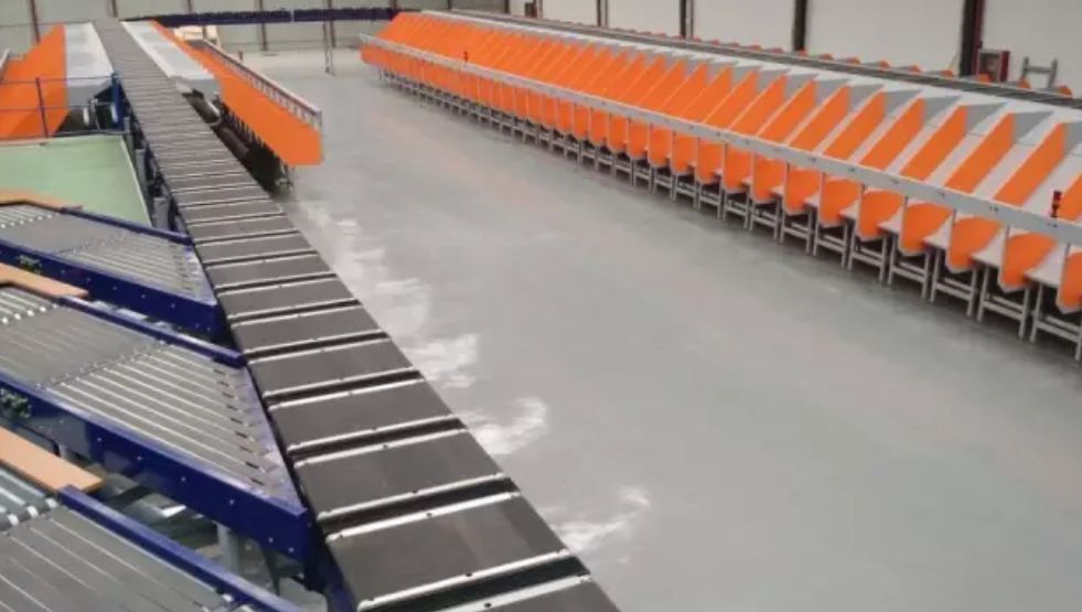 交叉帶分揀機,交叉帶分揀機有很多種型式,比較普遍的為一車雙帶式,即一個小車上面有兩段垂直的皮帶,既可以每段皮帶上搬送一個包裹也可以兩段皮帶合起來搬送一個包裹。在兩段皮帶合起來搬送一個包裹的情況下,可以通過在分揀機兩段皮帶方向的預動作,使包裹的方向與分揀方向相一直以減少格口的間距要求。優(yōu)點:噪音低、可分揀貨物的范圍廣,通過雙邊供包及格口優(yōu)化可以實現(xiàn)單臺最大能力約2萬件每小時。缺點:造價比較昂貴、維護費用高。