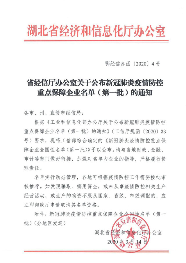 湖北顯浩被省經信廳列為全國新冠肺炎疫情防控重點保障企業